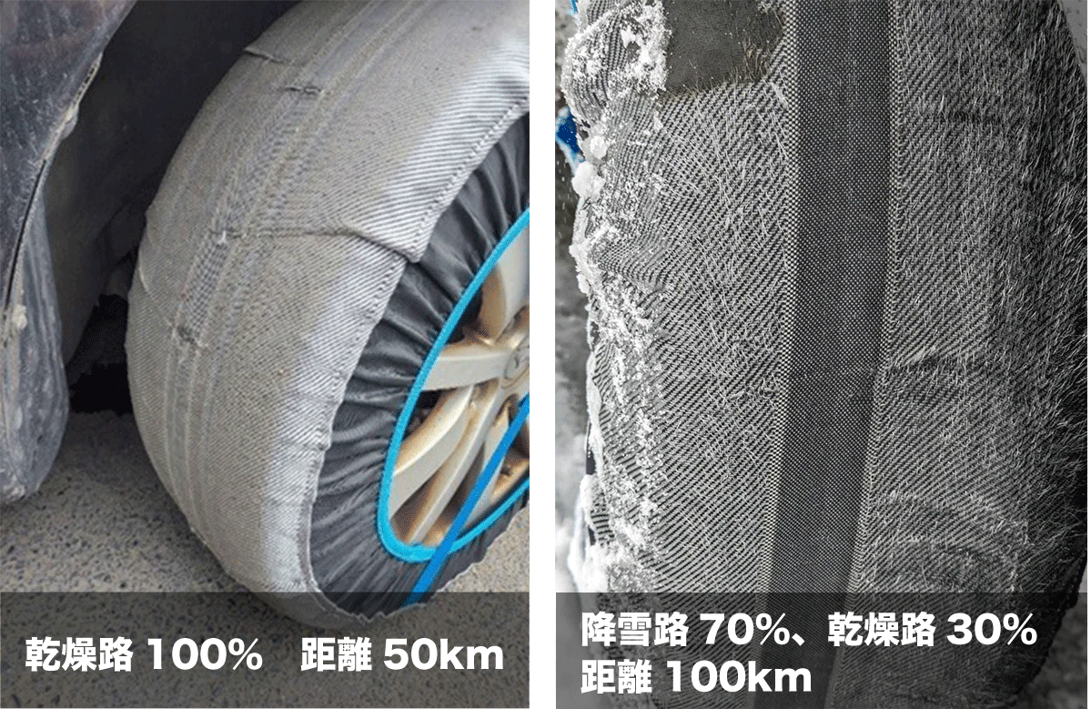自社試験において時速40Km/hで乾燥路(雪がない状態)100%で走行した時、50km走行時点、または降雪路70%、乾燥路(雪がない状態)30%の割合で走行した時、100km走行時点までは大きな損傷がないことを確認しており、更に改良を加えています。凍結路の上り、下りを含む。